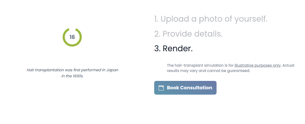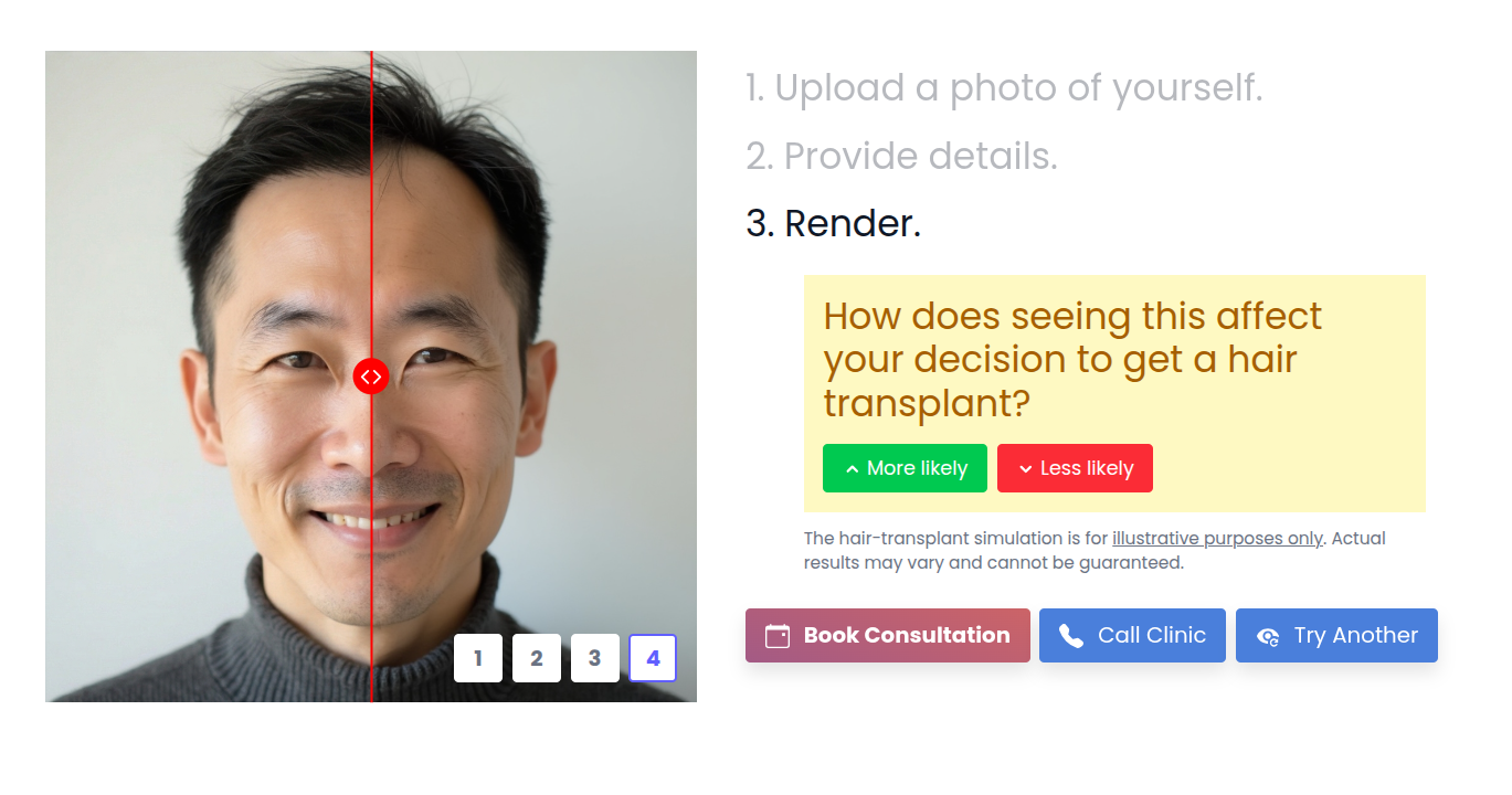 Effortlessly simulate hair loss with our AI. Our new Hair Loss Simulator tool lets you visualize the progression of hair loss using a single patient photo. Perfect for educating patients on the importance of early intervention and showcasing potential future outcomes. Simply upload a photo, and our AI will generate realistic simulations of hair loss over time, helping patients make informed decisions about their hair restoration journey.